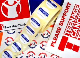 Harris Screen Print manufactures charity lapel stickers, all made to order. For smaller sized charities, lapel stickers on sheets are often more cost effective. For medium to large charitable organisations, we manufacture lapel stickers on rolls. See our dedicated charity sticker page and stickers on a roll page for more details.